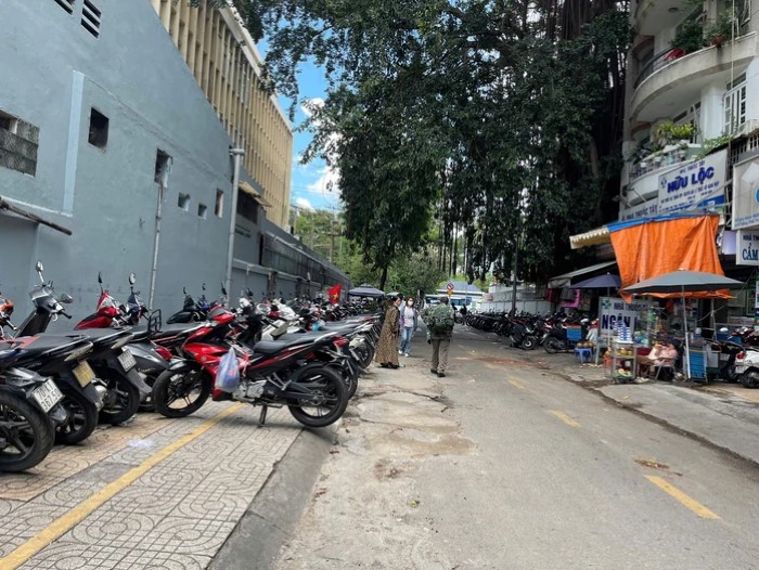 Theo ghi nhận của phóng viên, chiều 7-10, trên vỉa hè đường Đặng Thái Thân – đoạn cạnh Bệnh viện Đại học Y dược TP HCM, hàng trăm xe máy dựng san sát 2-3 hàng. Vỉa hè ở đây đã trở thành những bãi giữ xe tự phát.